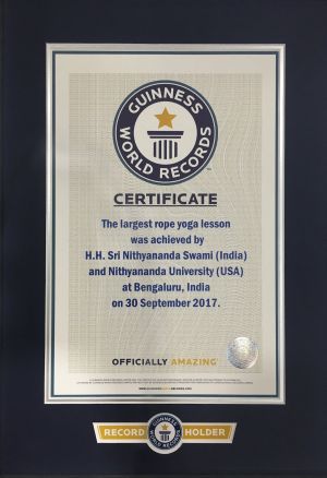 | + | [[File:Yoga 4.jpg|thumb|HDH Nithyananda Paramashivam and Nithyananda University (USA) declared officially amazing by the Guinness World Records on 30 September 2017 for the largest rope yoga lesson. ]] | ||