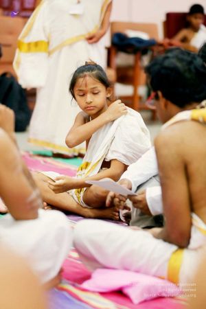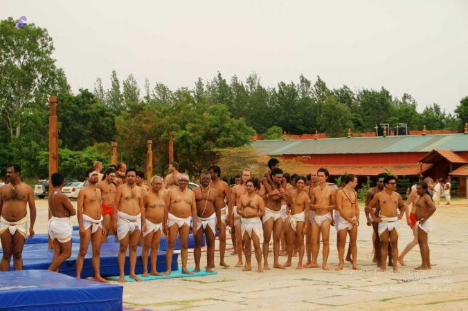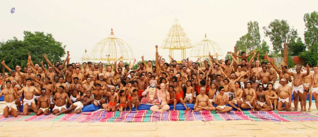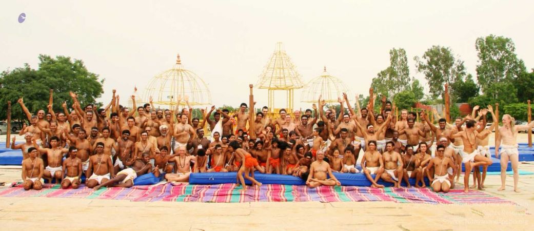 Balasants, adheenavasis and delegates ending the Shivastambha (mallakhamba) yoga session with gratitude and poorna mantra