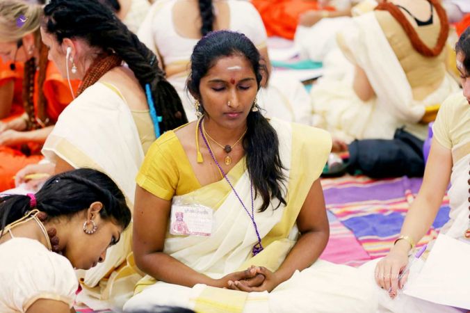 Reverential prayer prior to next demonstration of Nithyananda Yoga