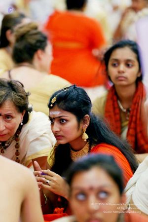 Delegates waiting in the line to receive darshan of HDH Nithyananda Paramashivam
