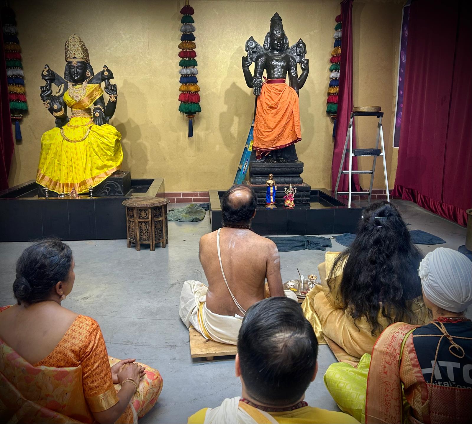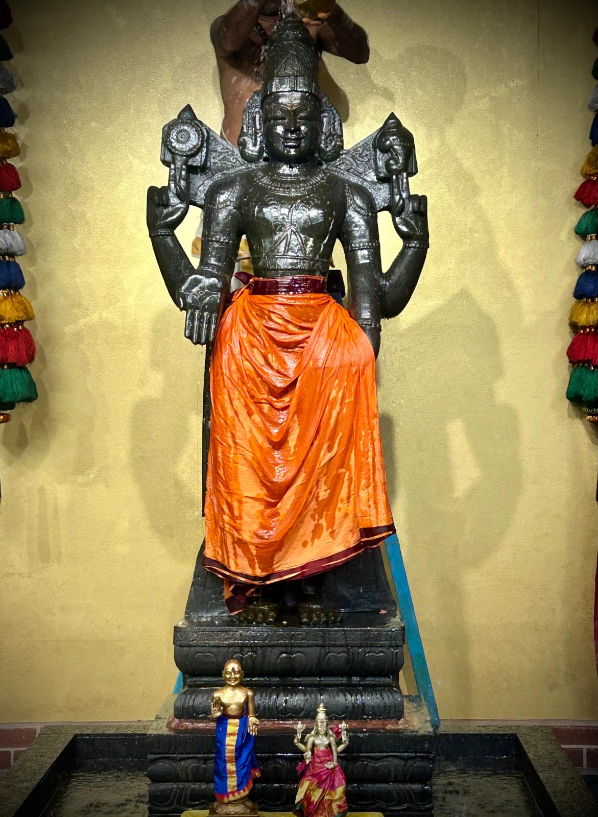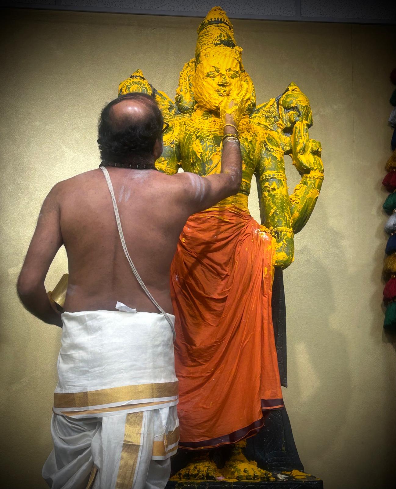 The core of the celebration was the Bhagawan Venkateshwara Thirumanjanam, a powerful and deeply moving sacred bathing ritual (Seva) offered to the deity, Sri Ananda Venkateshwara. This special Thirumanjana Seva involved devotional offerings, including sacred Milk and Turmeric, which are known to carry immense spiritual potency for purification, blessing, and the attraction of divine energies. This ancient Hindu ritualistic practice ensures that the environment and the consciousness of the participants are saturated with the auspicious vibrations needed for a successful year ahead, full of growth and prosperity.