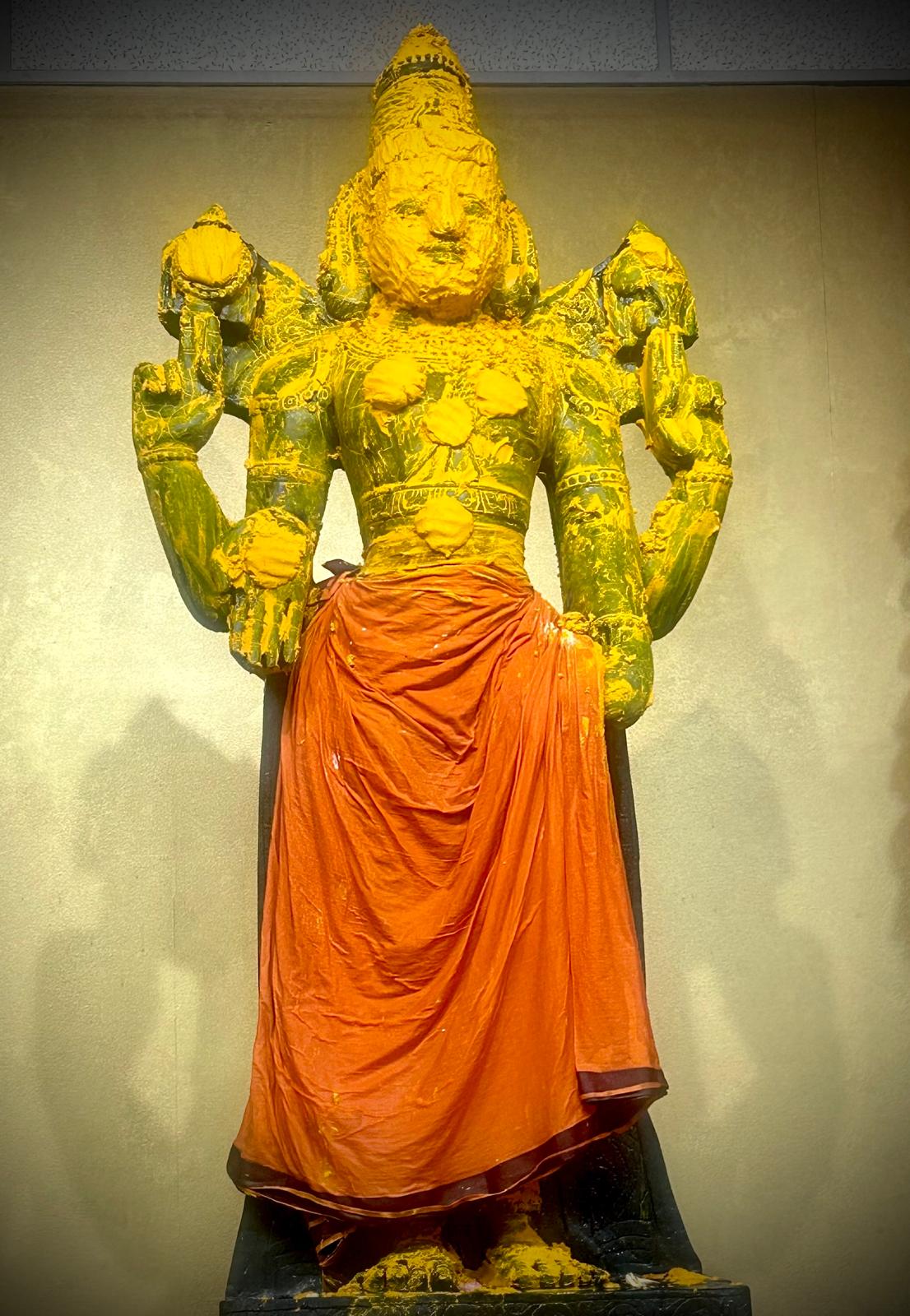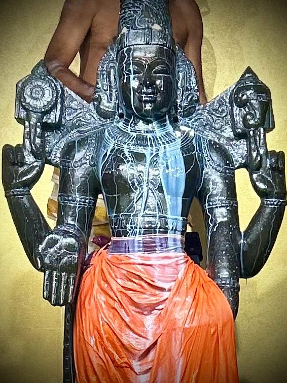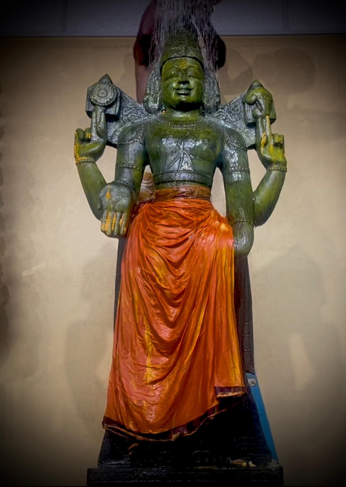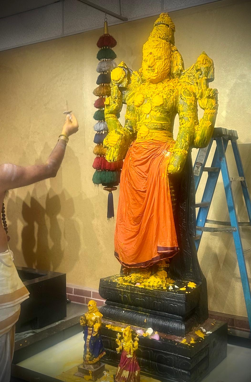 The core of the celebration was the Bhagawan Venkateshwara Thirumanjanam, a powerful and deeply moving sacred bathing ritual (Seva) offered to the deity, Sri Ananda Venkateshwara. This special Thirumanjana Seva involved devotional offerings, including sacred Milk and Turmeric, which are known to carry immense spiritual potency for purification, blessing, and the attraction of divine energies. This ancient Hindu ritualistic practice ensures that the environment and the consciousness of the participants are saturated with the auspicious vibrations needed for a successful year ahead, full of growth and prosperity.
