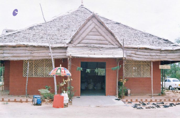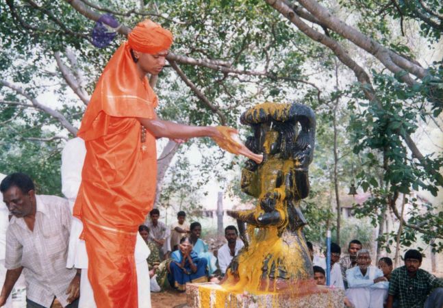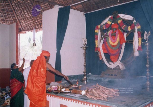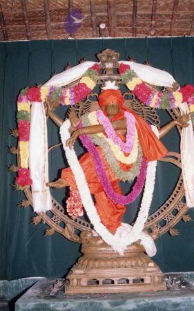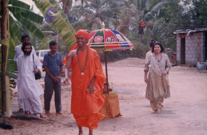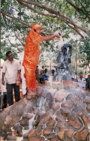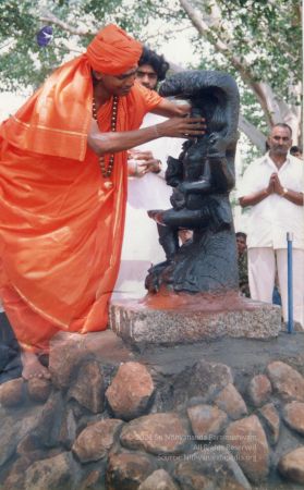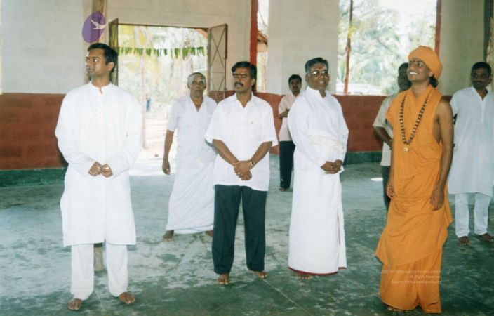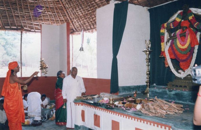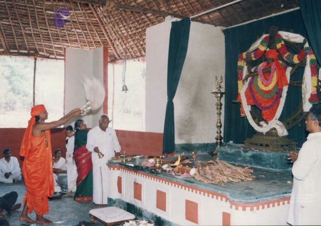 Further, as part of inaugurating the Ānanda Sabha - the humble structure made of bamboo and bricks, one can see The SPH Himself again offering the fire ritual (homa), decoration (alankār) and lit camphor (ārati) to the Naṭarāja deity inside the Ānanda Sabha. Before start of the official ceremony, The SPH is seen in His everyday saffron robes, immersed in adorning the Naṭarāja deity with robes, flower garlands and ornaments. After completing the preparation of the deity, He can be seen in changed attire for the inaugural ceremony, moving with the small group of devotees for the historic inauguration.