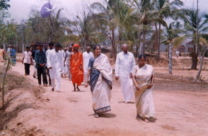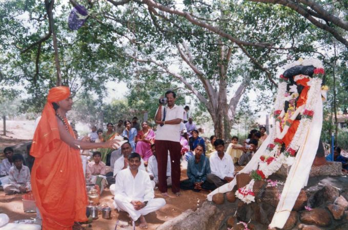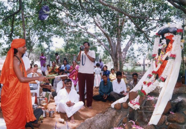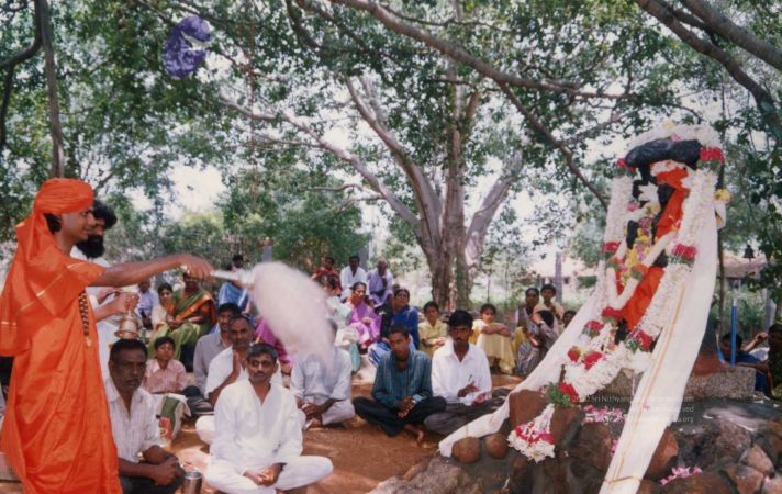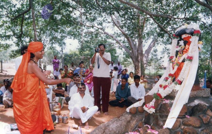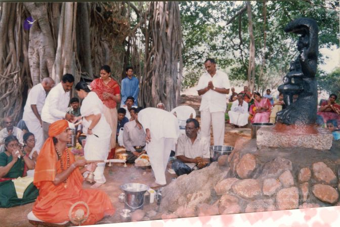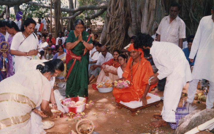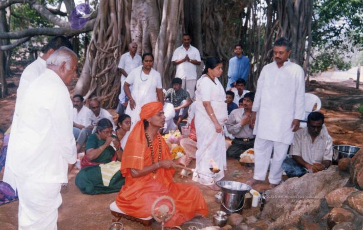 The blessed gathering of early devotees sat and watched the entire proceedings personally conducted and offered by The SPH Himself, under the glowing foliage of the sacred Banyan.