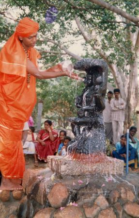One can see The SPH, adorning the role of ācārya - Śaiva preceptor - offering the sacred offerings. He offers the arghya - made up of water to wash, durvā grass, flowers and akṣata (turmeric smeared rice), all of which together symbolise one's mundane mind which is offered to the Guru in surrender. The SPH reveals beautifully in a talk in Uttarakhand, in the scenic environs of the Himalayan mountains on 12th Jul 2007, while explaining the ritual of Guru Puja: "MANASTU ARGHYAM NIVEDAYET: 'MANASTU' IS A PLURAL WORD. IT MEANS 'MINDS'. YOU DON’T HAVE ONE MIND. YOU HAVE A PART OF THE MIND OF ALL THE PEOPLE AROUND YOU! ALL THE MINDS YOU OFFER AS ARGHYA!"