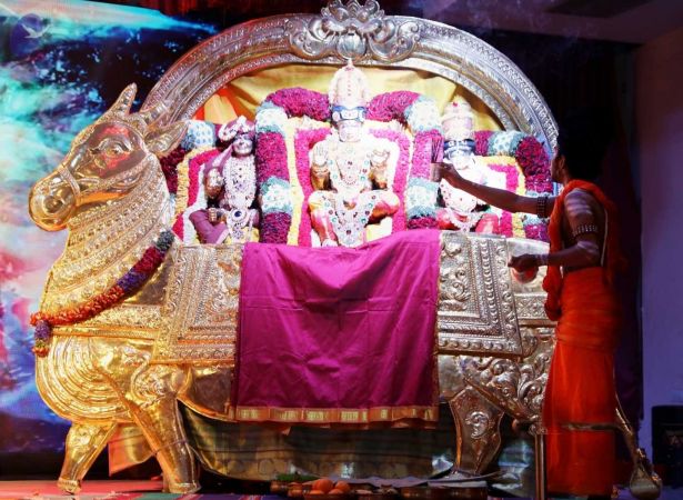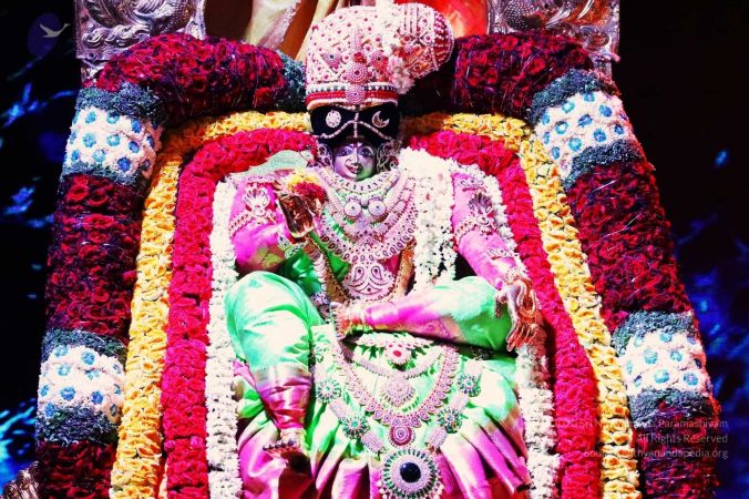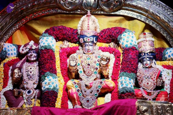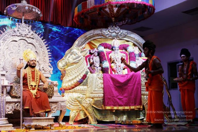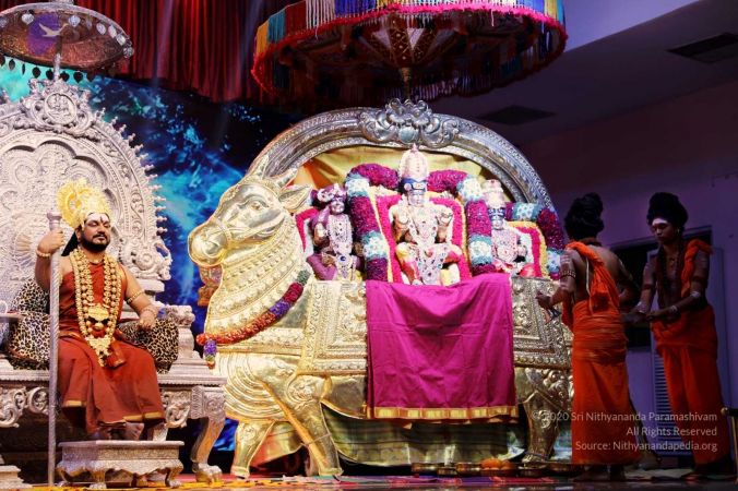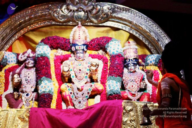 Nithyananda Purnima Brahmotsavam celebration special alankars (decoration) done for HDH Nithyananda Paramashivam, Sundareshwara, and Meenakshi Devi