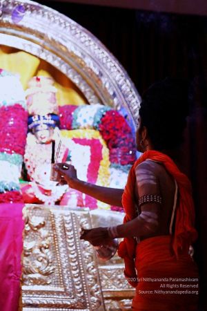 Balasant offering Aarti (lamp) to special Leela Alankar (decoration) deites of Sri Nithyananda Swami's Life - LEELA OF PARASHAKTI DARSHAN