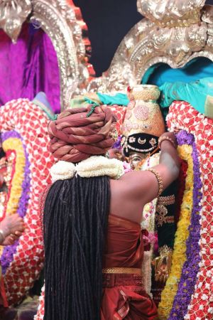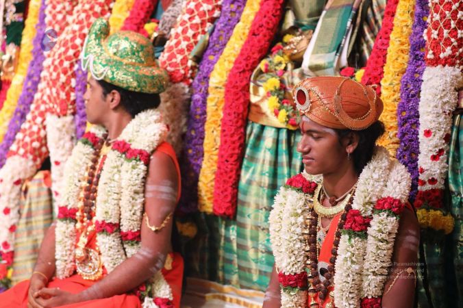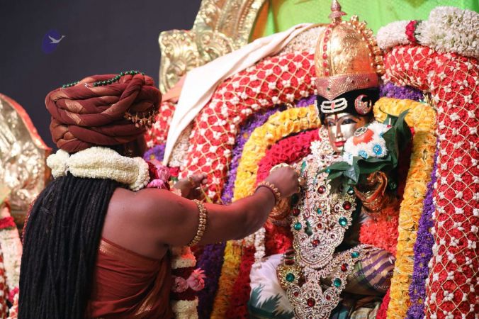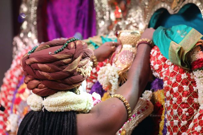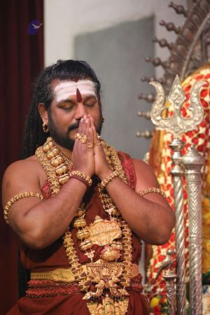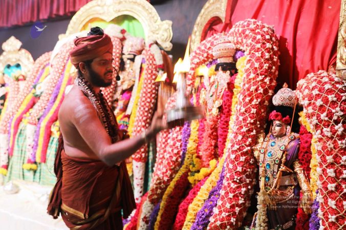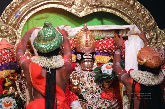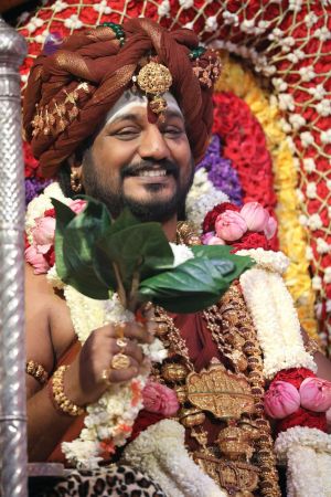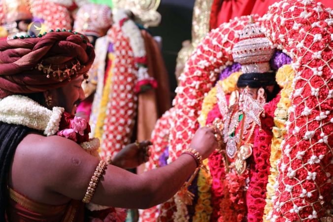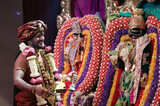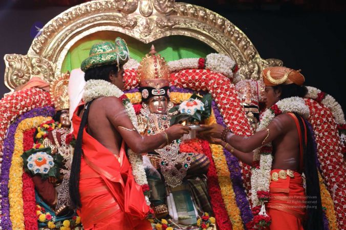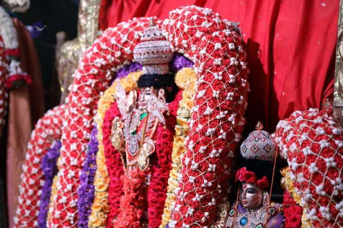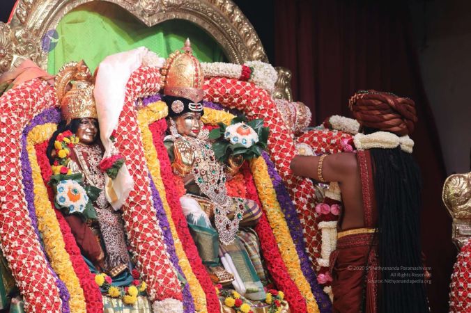 Meenakshi Thirukalyanam - The celestial marriage of Nithyanandeshwara Paramashiva and Nithyanandeshwari Parashakti, in their incarnations as Lord Sundareshwara and Goddess Meenakshi re-enacted by temple priests. This occassion was celebrated in a grand way at Nithyananda Peetham, Bengaluru Aadheenam, in the traditional Pandya style.