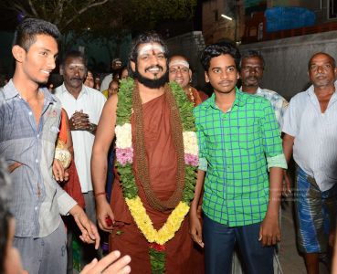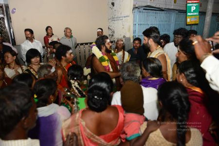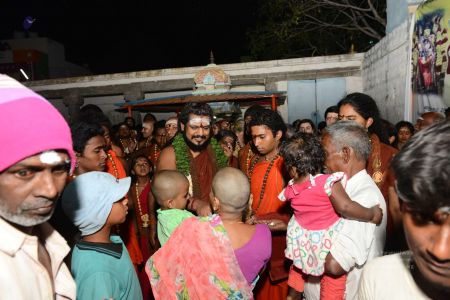 His Divine Holiness blessing devotees with vibhuti at the Mariamman Temple in Thiruvannamalai