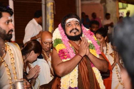 His Divine Holiness blessing devotees at the Panchamurti Procession of the Annamalaiyar Temple in Thiruvannamalai