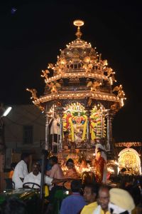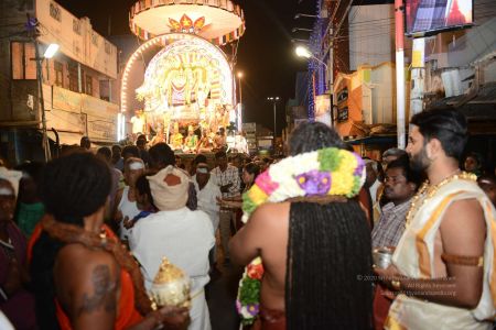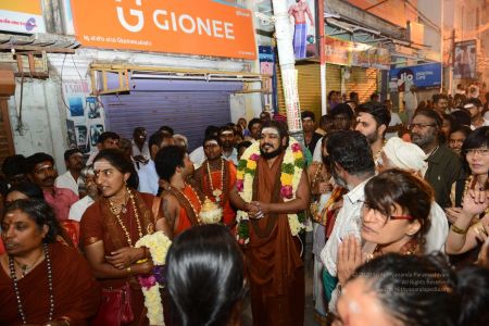 His Holiness blesses devotees on the streets of Tiruvannamalai in Panchamurthi Procession of the Annamalaiyar Temple in Thiruvannamalai