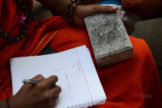 Relax. You can open your eyes. And start manifesting the power now. Each Nithyananda Yogam participant can sit with one balasant and once they manifest the power you can go back for your completion. Each Nithyananda Yogam participant can come up and pick up any one book inside. Don’t show anything to your balasant, not even the wrapper. Just cover it and you just tell the page number, they will see in the Krista Shila and write. Come on. Start!