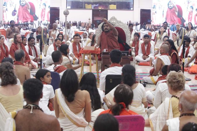 HDH Nithyananda Paramashivam welcoming the delegates during the morning satsang.