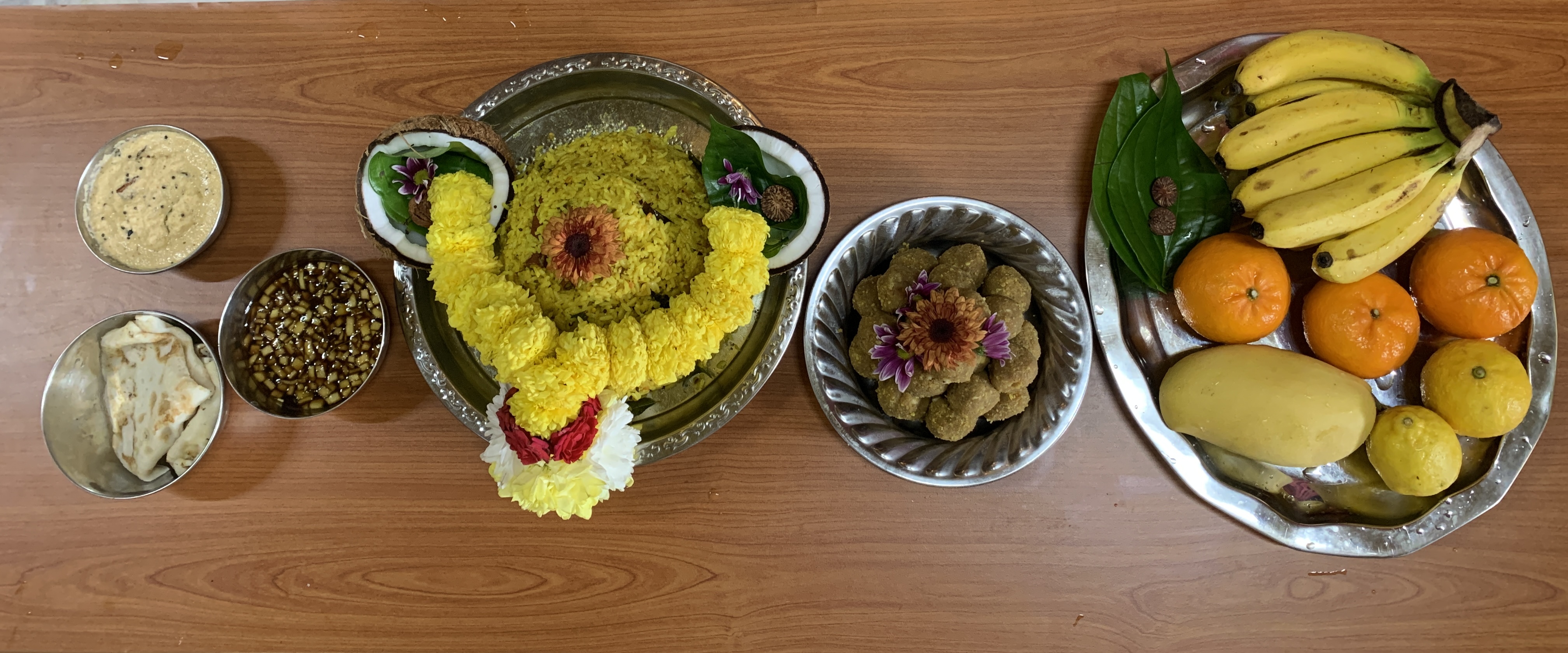The sacred offerings included a variety of traditional dishes, each holding deep symbolic significance in Hindu tradition. The Naivedyam featured Tamarind Rice, Dosa with chutney, and the sweet delicacy of Bhoondi Laddu, complemented by an assortment of fresh fruits. A highlight of the ritual was the preparation of Pachadi, a unique dish incorporating six distinct tastes—sweet, sour, salty, bitter, pungent, and spicy. This traditional preparation symbolizes the various experiences of life, teaching the devotee to accept all facets of existence with equanimity and a high state of consciousness.
