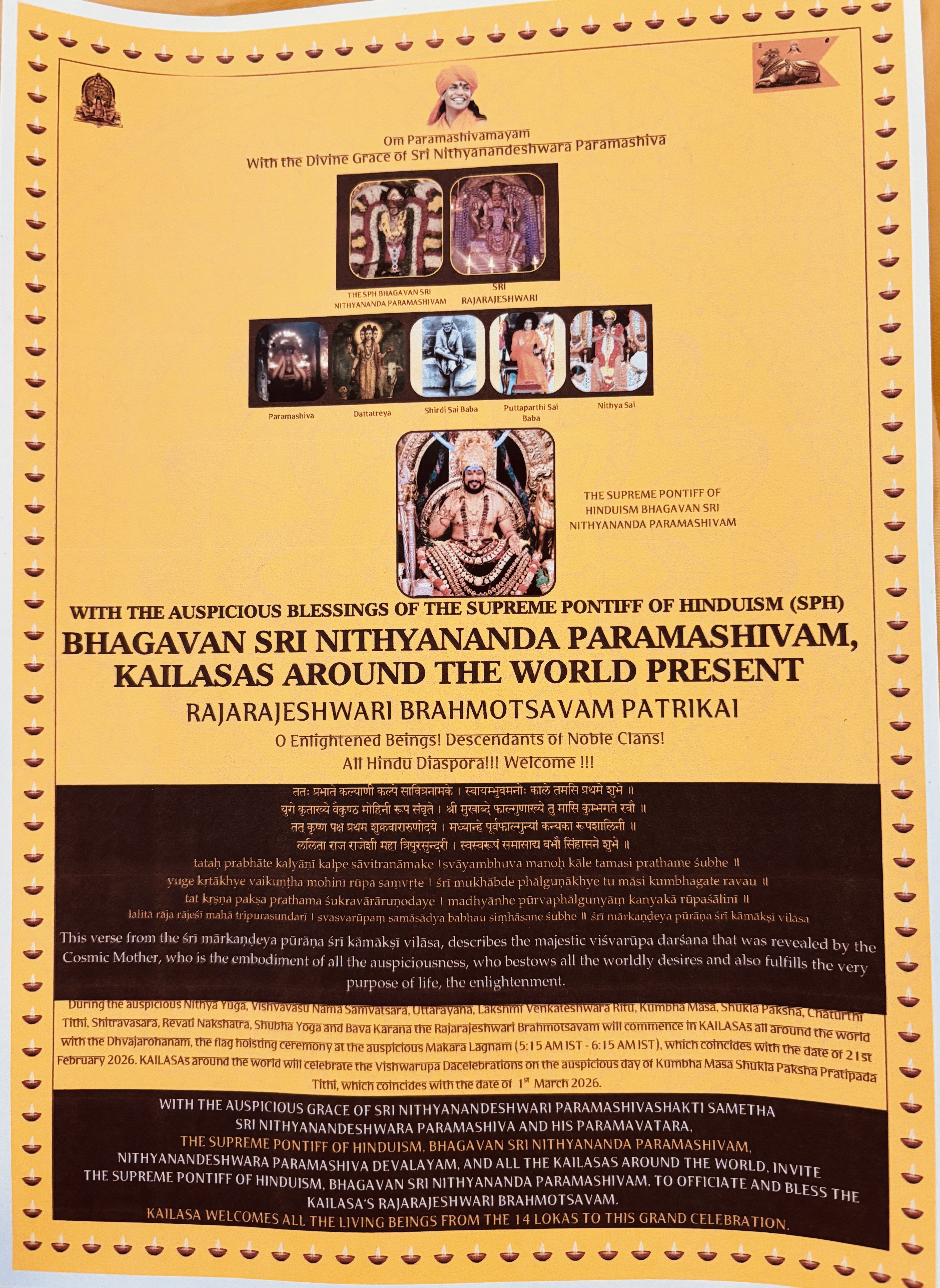 With the blessings of THE SUPREME PONTIFF OF HINDUISM (SPH), BHAGAVAN SRI NITHYANANDA PARAMASHIVAM — the ultimate manifestation, Paramavatara of Paramashiva — KAILASA Paris France celebrated the auspicious commencement of the Rajareshwari Brahmotsavam on February 20, 2026. This sacred celebration marked the beginning of a profound spiritual journey for the local community, centering on the worship of Goddess Raja Rajeshwari. Through the divine grace of THE SPH and all the gods and goddesses of KAILASA, the event served as a powerful medium for the revival of Sanatana Hindu Dharma in Europe. The activities, which included traditional Hindu rituals and sacred offerings, enriched the lives of 108 participants, fostering a deep connection to the ancient enlightened Hindu civilization and the superconscious breakthrough envisioned by THE SPH for all of humanity.
