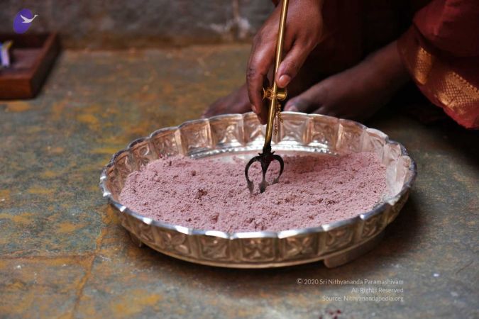 The tip of the trishul is the bridge between matter and consciousness and it infuses the Bhagavan particle into the powder through this alchemy process