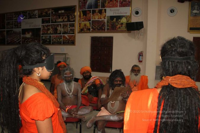 Balasants displaying blind fold power demonstration to the the sadhus of Panchayati Akhada, Niranjani