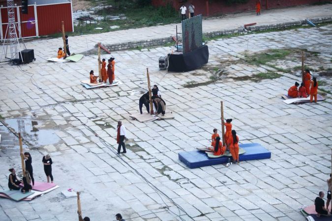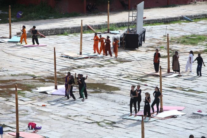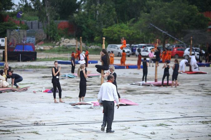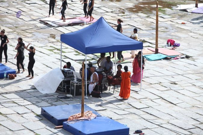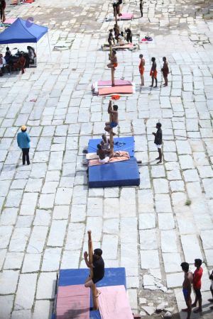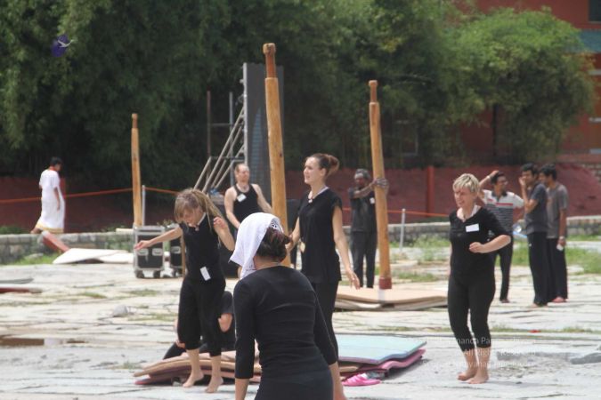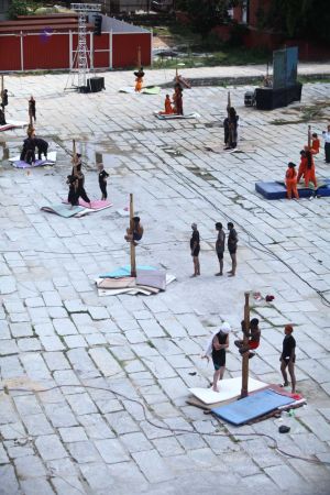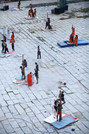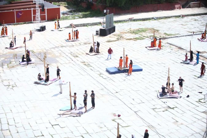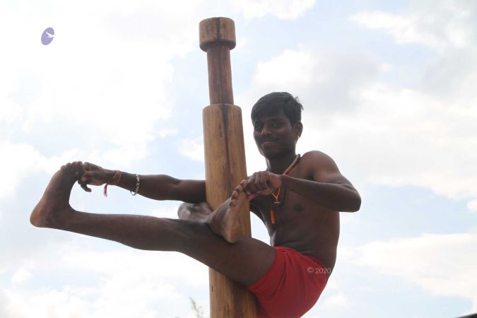 Warming up and performing basic yoga asanas right before the demonstration session of shivastambha (mallakhamba) yoga asanas