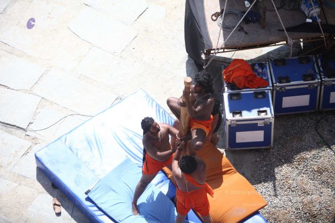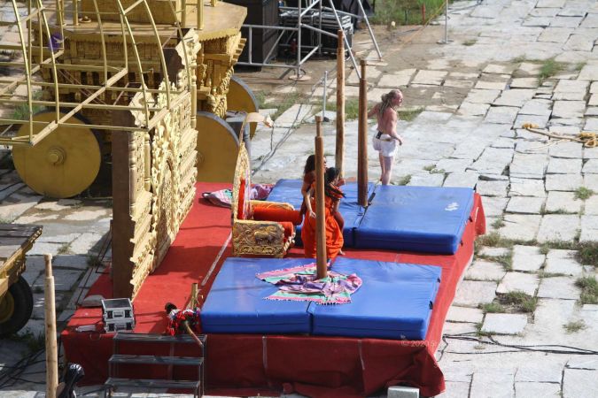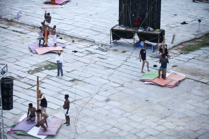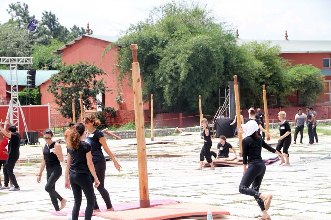Warming up and performing basic yoga asanas right before the demonstration session of shivastambha (mallakhamba) yoga asana