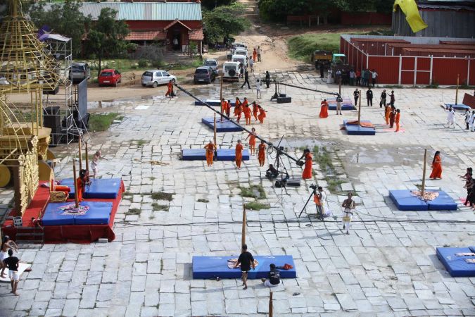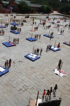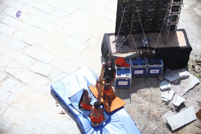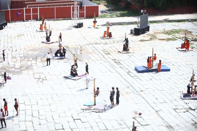Aerial view of shivastambha (mallakhamba) yoga demonstration by balasants, sannyasis, adheenavaasis and delegates