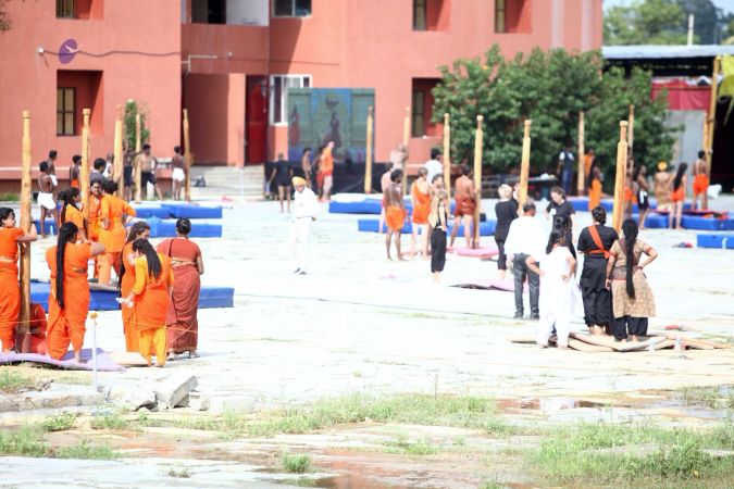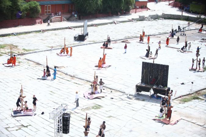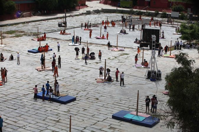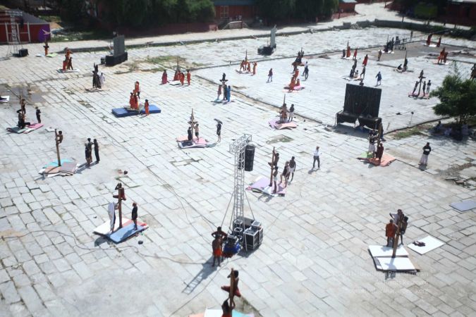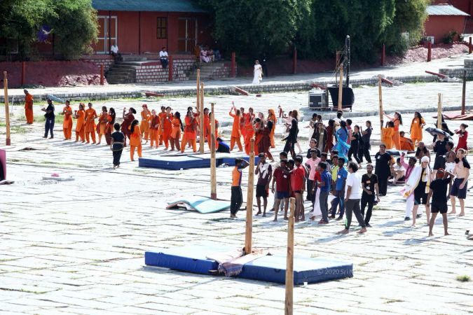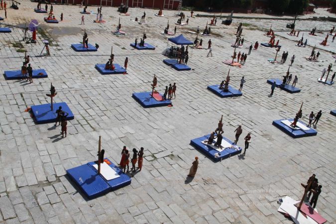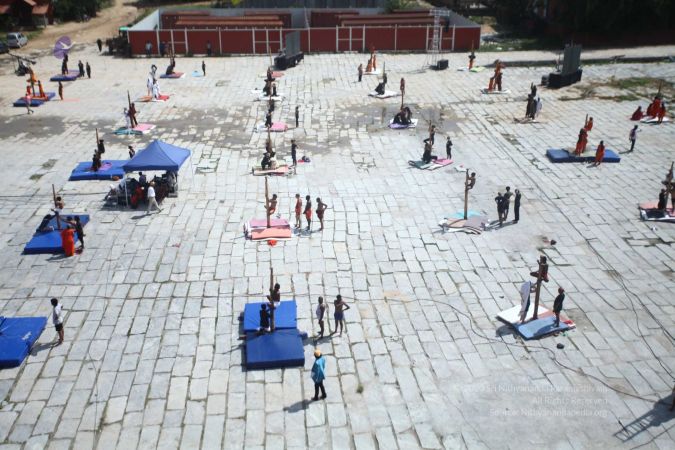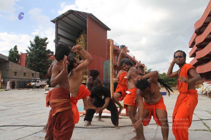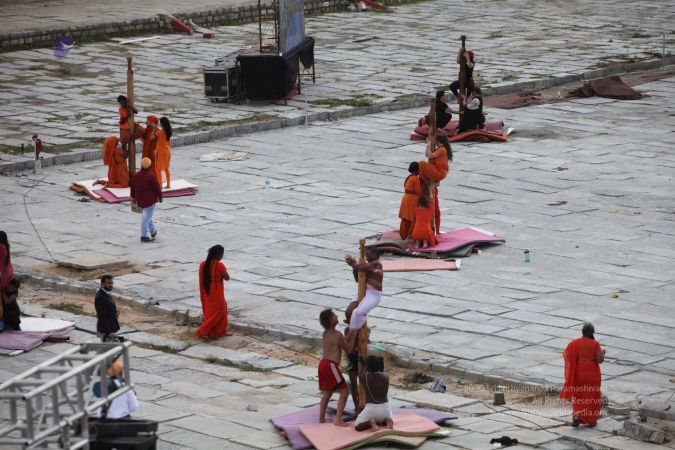 Balasants, sannyasis, adheenavaasis and delegates ready for shivastambha (mallakhamba) yoga asanas demonstration event