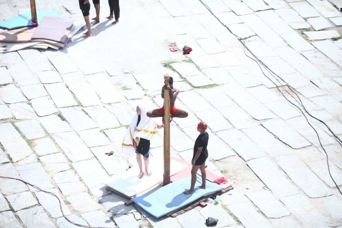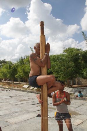 Praying and invoking guru's blessings for demonstration of shivasthambha or pole yoga