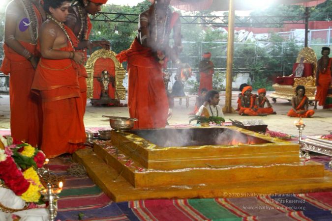 Balasant offering poorna ahuti (oblations) consecrated by HDH Nithyananda Paramashivam into sacred fire appeasing the celestial entities in the presence of Guru