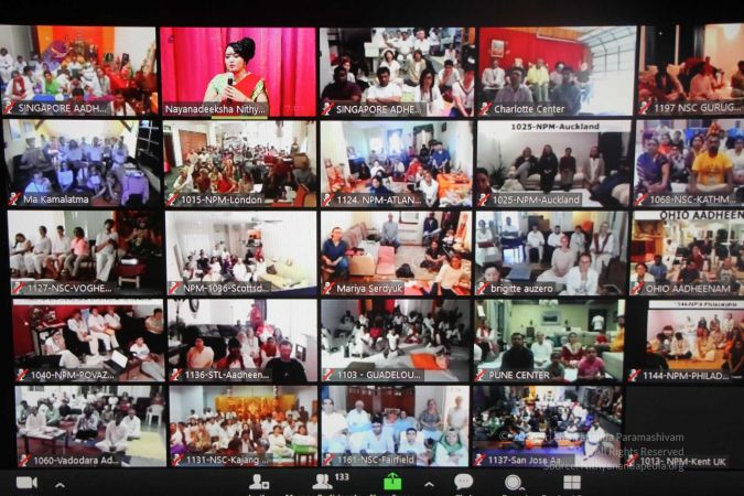 Ma Mahayoga welcoming delegates participating from across the world in the Aushadha convention in-person at Adi Kailaasa and in a two-way interactive video conferencing live