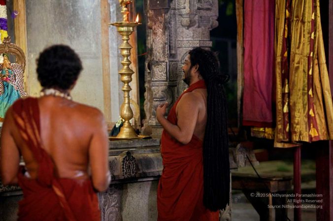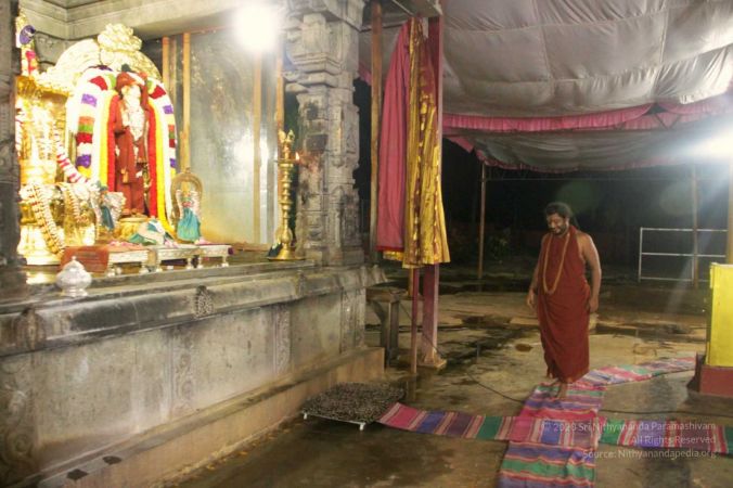 HDH Nithyananda Paramashivam offering prayers in a deep meditative space to deities at Sri Nithyanandeshwara-Nithyanandeshwari Temple on completion of Kapilamuni yagna