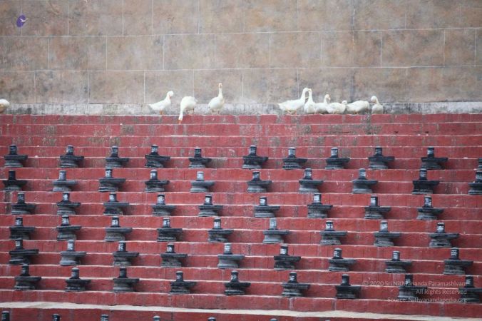 Adheenavasi and balasants offering ahbishekam and arti to Ananda Lingas present around Navapasana Vaidya Sarovar Linga