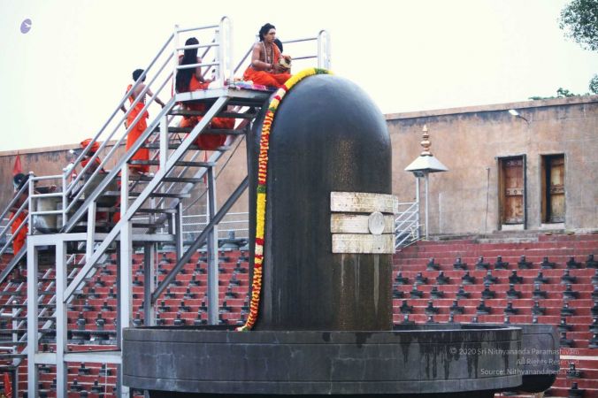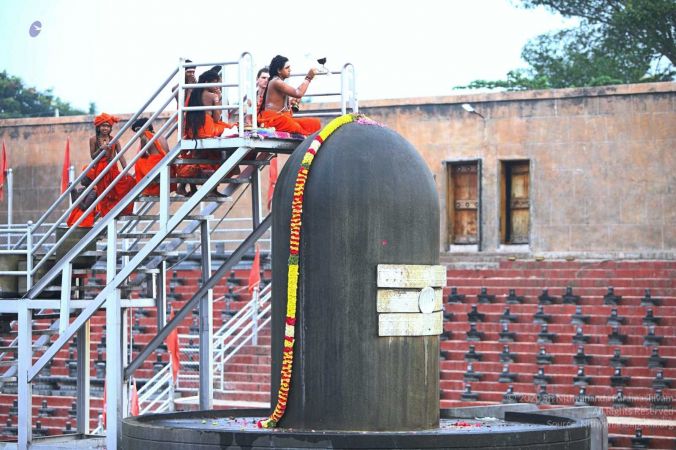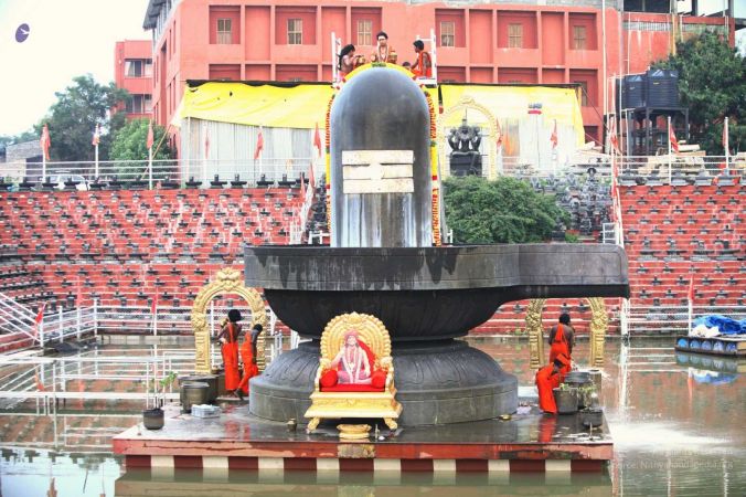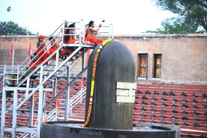 Adheenavasi and balasants offering ahbishekam and aarti to Ananda Linga at Vaidya Sarovar