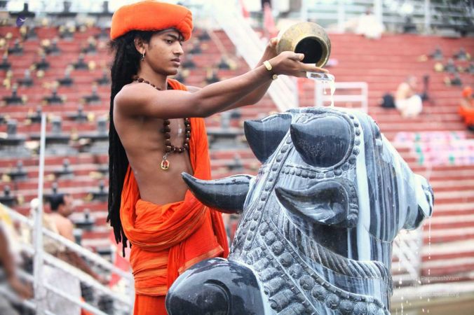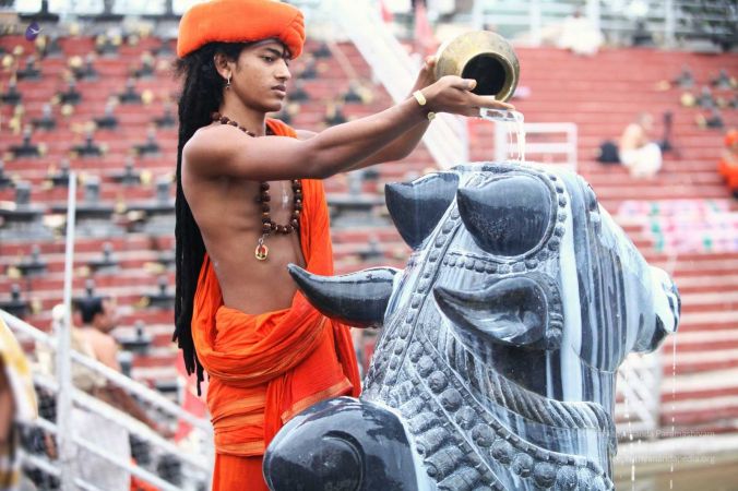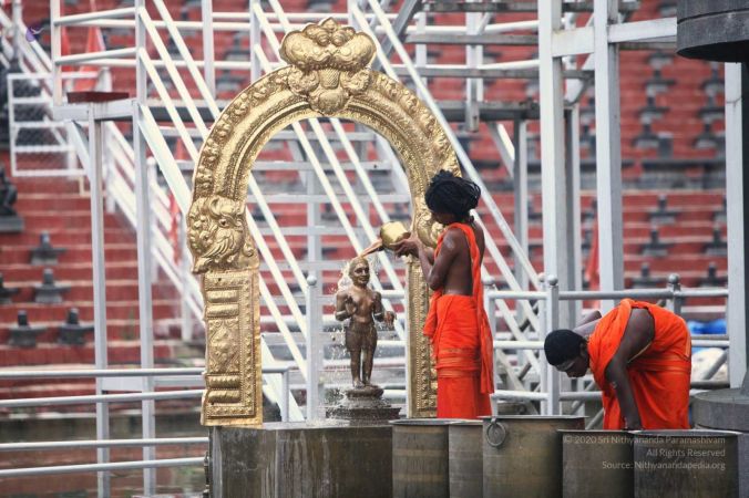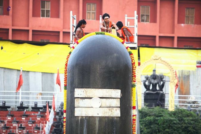 Balasants perfoming abhishekam to Vaidya Sarovar Linga, Nandi and Bhogamurthy of HDH Nithyananda Paramashivam at Adi Kailaasa