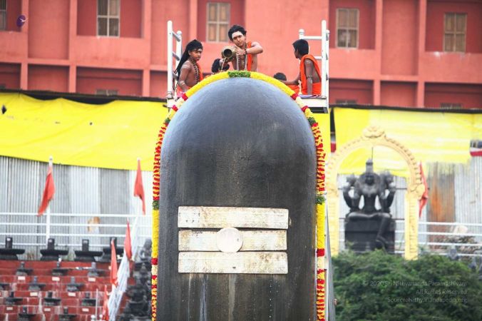 Ahbishekam of 21-foot Ananda Lingam which has been made using Nava Pashana (a strong natural medicine made of healing herbs) and 1008 sacred herbs at Vaidya Sarovar performed by balasants - Adi Kailaasa, Bengaluru Aadheenam
