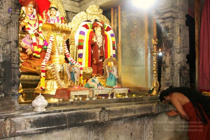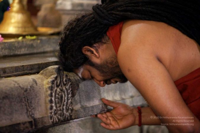 HDH Nithyananda Paramashivam bowing in a deep meditative space to the deities at Sri Nithyanandeshwara-Nithyanandeshwari Temple on completion of Kapilamuni yagna