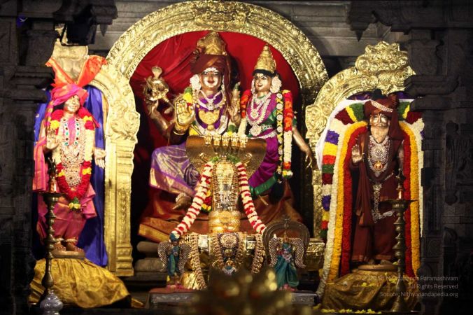 Adi Kailaasa temple deities are Svayambhu Linga, HDH Nithyananda Paramashivam, Kapila Mahamuni and Nithyanandeshwara-Nithyanandeshwari (Paramashiva and Parashakti)